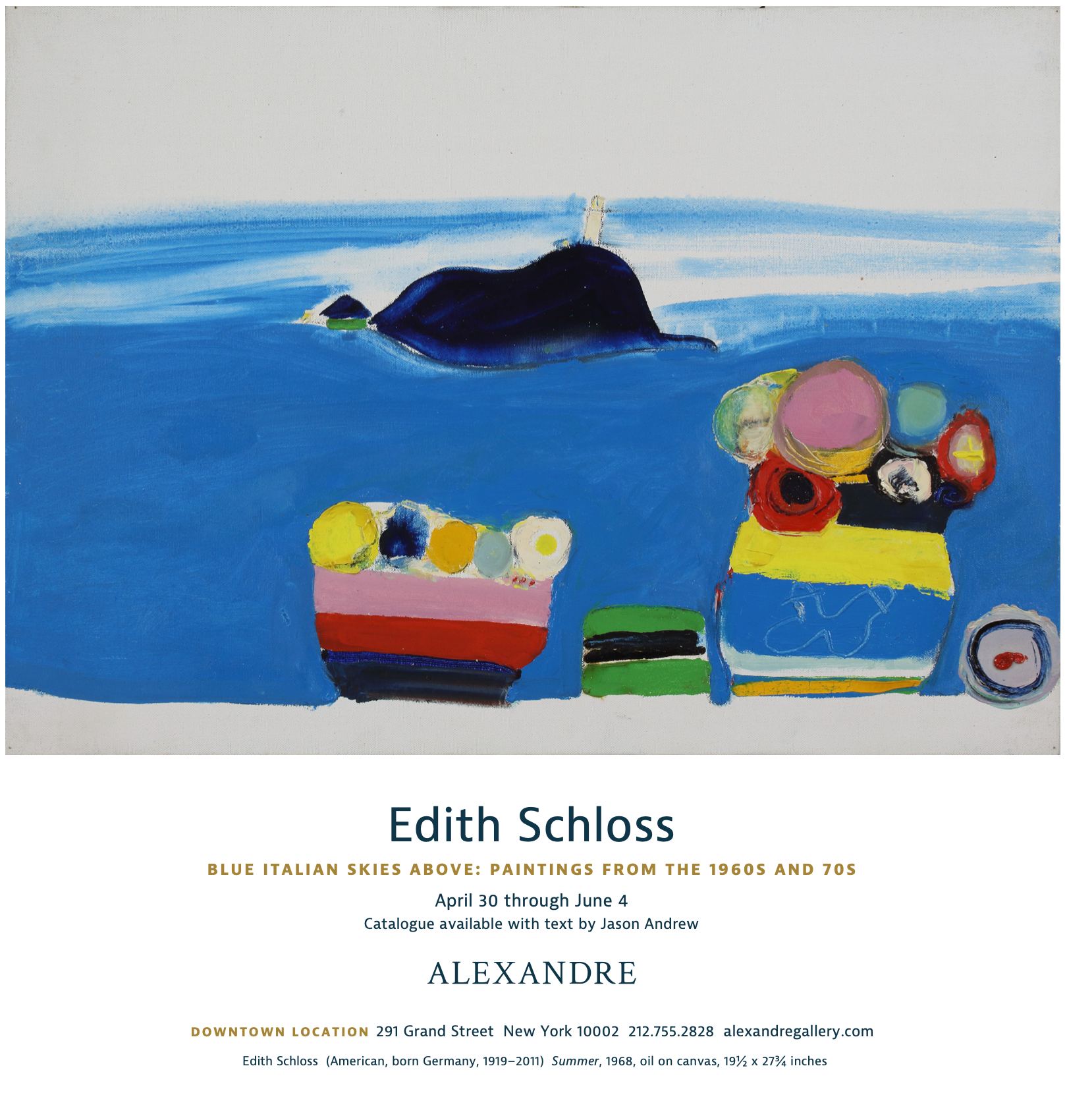 Alexandre Gallery is pleased to announce the exhibition Edith Schloss: Blue Italian Skies Above, the gallery’s inaugural exhibition of works by the artist (1919-2011), marking its representation of the estate. Examining Schloss’s work from the 1960s and 70s, this exhibition presents a collection of never-before-seen works, many of which were produced during the artist’s summers overlooking the bay of La Spezia, Italy. Edith Schloss: Blue Italian Skies Above, Paintings from the 1960s and 70s will be on view from April 30-June 4 and will be accompanied by a catalogue with new scholarship by Jason Andrew. Public reception will be Saturday, April 30 3-5p.