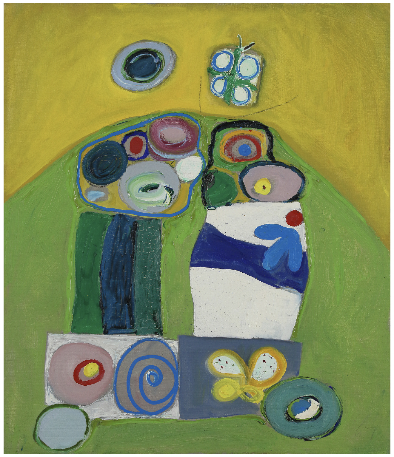 Bold and at times brash, Schloss ingested the style and mentality of the Abstract Expressionists among which she was intrinsically linked. Her work spans painting, assemblage, collage, watercolor, and drawing and embraces the intimate, the primitive, and the profound. Guided by a delight in pure color and childlike curiosity, her playful imaginings of still lifes, laid over vibrant renderings of views out of open windows onto the Mediterranean sea, are a joyful celebration of common wonders. These works, manifest her new-found acquaintance with Giorgio Morandi, feature tchotchkes collected and arranged, animating the symbolism of each item: “I look at them and the weather before me,” she said, “and try to have clear ideas about it all and the world, and to put it down in the simplest color and line […] Abstract art? Figurative art? All art is a fusion of the real outside, and that which is inside us.”